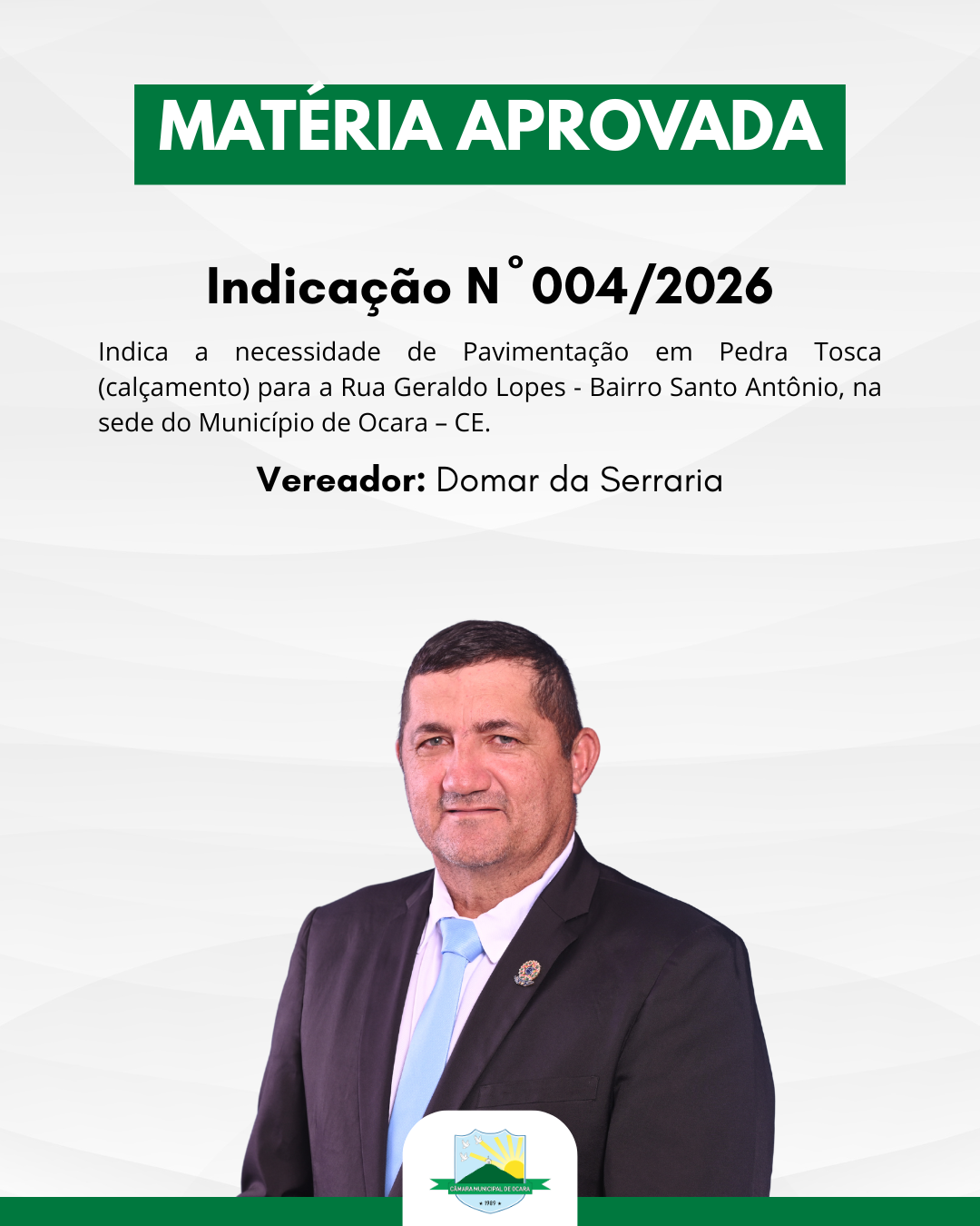 02/03/2026 09:40:45 Matérias Aprovadas,Notícias,Outros Indicação N° 004/2026 Aprovado!✅ Indica a necessidade de Pavimentação em Pedra Tosca (calçamento) para a Rua Geraldo